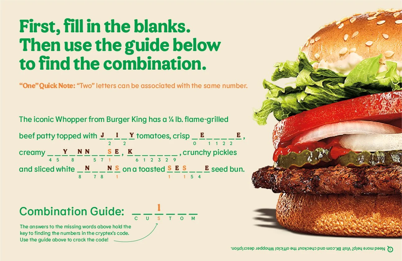 The team created the BK Cryptex – a unique, custom 3D-printed combination puzzle box that could only be opened by solving themed clues and entering the exact number of possible Whopper Combinations (221,184). The Cryptex was shipped off to 50 influencers before taking social media by storm, going viral overnight, and racking up more than 45 million organic views across top social platforms. To round out the effort, the team dug deep with Burger King to leverage Whopper sales data from coast to coast, uncovering “which hamburger-loving states reign supreme.” These insights were used to create a superlative-style infographic that definitively — and proudly — highlighted Whopper customization preferences by state. Just in time for National Hamburger Day!