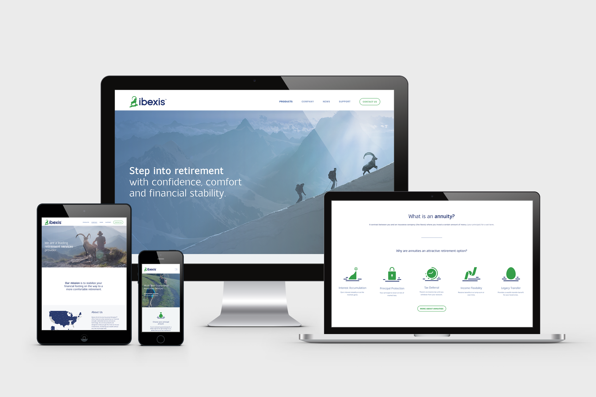 When ICR was approached by the company — who was named Sunset Life at the time — they were in search of a name and visual brand that was much more modern and much less depressing for elder investors. After working through 100s of options, the client landed on Ibexis as the right choice for their new mission. They loved the technical tone of the name as well as the symbolic strength and agility provided by the ibex.